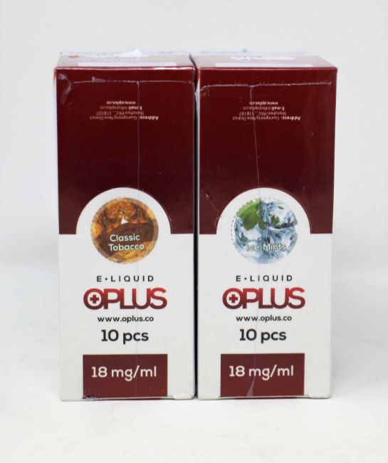 Six boxes of ten (10ml) OPLus E-Liquid in Classic Tobacco and Ice Mint 18mg/ml (Over 18s only).