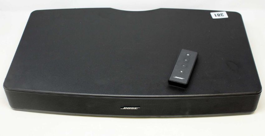A pre-owned Bose Solo Television Sound System with remote and power cable (Powered on but not tested further).