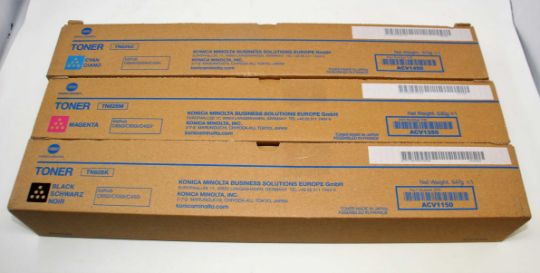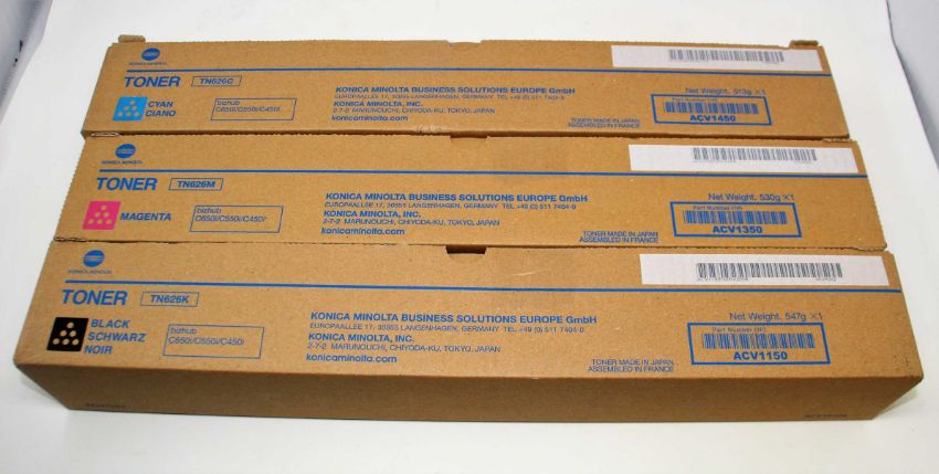 A boxed as new Konica Minolta TN626K Black Toner ACV1150, a boxed as new Konica Minolta TN626C Cyan Toner ACV1450 and a boxed as new Konica Minolta TN626M Magenta Toner ACV1350 (All boxes sealed).