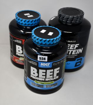 Two NXT Nutrition Beef Protein Isolate (1.8kg, 60 servings) in green apple and strawberry-lime flavour (BBE Aug/Nov 22) and one BioTech USA Beef Protein Drink Powder with L-Arginine (1.816kg, 60 servings) in chocolate coconut flavour (BB 02/09/23).