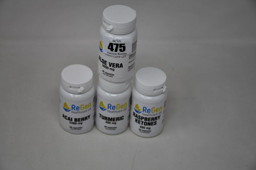 A large quantity of ReGen Healthcare food supplements to include Turmeric 400mg, Aloe Vera 6000mg, Acai Berry 2400mg and Raspberry Ketones 400mg (Approximately 80 x 30 capsules).