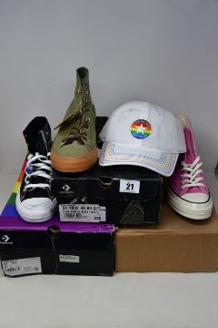 A pair of as new Converse Chuck Taylor All Star High Pride sneakers (UK 8.5 - mark on of right shoe toes, requires cleaning), Converse Pride baseball cap, Converse Earthy Buck Trek Hi sneakers (UK 8) and Converse Chuck Taylor All Star Hi in pink/white (UK 7).