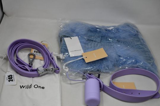 An as new Wild One leashes in lilac (RRP $58), collar in lilac (XL - RRP $38), poop bag carrier in lilac (RRP £15) and a Christian Cowan X Max Bone dog jumper in light blue (S - RRP $95).