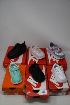 Six pairs of as new toddler Nike trainers; Hurache Run Ultra (UK 4.5), Air Force 1 (UK 2.5), Air Max 90 (UK 6.5), Downshifter 8 (UK 4.5), Court Borough Low 2 (UK 7.5) and Air Max 90 LTR (UK 4.5).