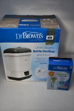 A collection of boxed Dr Brown's Baby Feeding items to include: 1 x Clean Steam Bottle Sterilizer and Dryer and 1 x Anti-Colic Two Wide-Neck Bottles Kit.