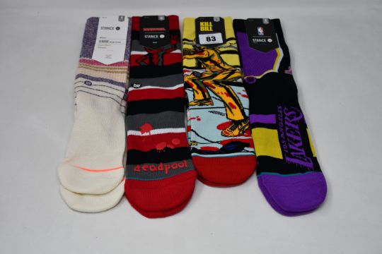 A quantity of as new Stance socks to include Deadpool, Space Food, The Bride & Gogo, Heat Shortcut 2, Warriors, Nuggets, Celtics, Spurs and Robert (Assorted sizes - approximately 20 pairs).
