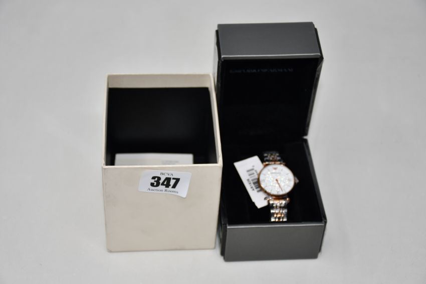 A women's boxed Emporio Armani AR1926 rose gold wristwatch.