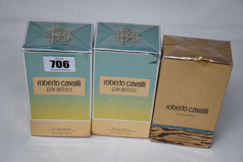 Two Roberto Cavalli Paradiso eau de parfum (2 x 75ml) and a Roberto Cavalli eau de parfum (75ml) (Slight dents to outer boxes).