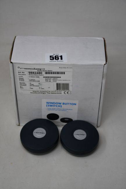 A box of ten as new Nedap long-range vehicle identification tags (PN: 9882480 - Window Button (Switch) (Box opened to check unit quantity).