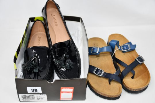 A pair of as new Jones Bootmaker Geranium black patent loafers (UK 9) and Jones Bootmaker Feix sandals (UK 6, no box).