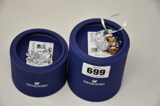 A boxed as new Swarovski ornament bear swinging on half moon inscribed Baby's 1st Christmas 2020 (5533941) and a Swarovski Labrador puppy ornament (5408608).