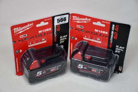 Two as new Milwaukee M18B5 18V 5.0Ah Lithium-Ion Batteries.
