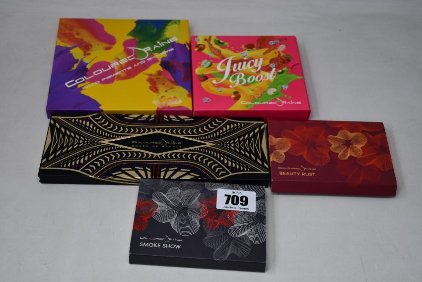 A collection of five Coloured-Raine eye shadow sets to include: one Juicy Boost 18 colour set, one Vivid Pigments and Shadows 16 colour set, one Queen of Hearts 12 colour set, one Beauty Rust 6 colour set and one Smoke Show 6 colour set.