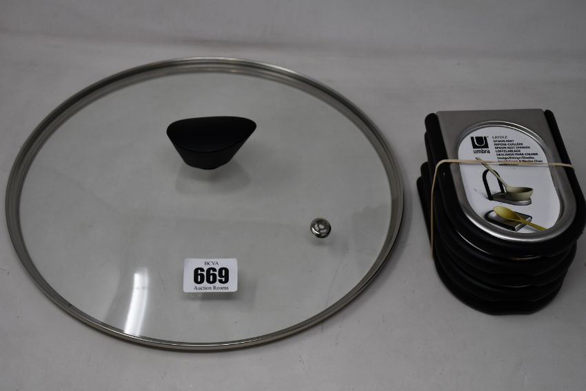 As new kitchen items; six boxed Ozeri 12" pan lids and five Umbra ladle spoon rests.