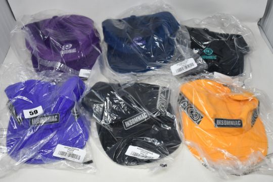 Six as new Insomniac LTD baseball caps; three Soltice (RRP $55 each) and three Velvet Dugout (RRP $55 each).