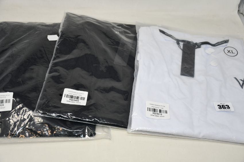 Two men's Vanquish Triumph Pullover hoodies in black and blackout (XXL), three Vanquish long sleeve T-shirts in black, white and grey (XL) and one Vanquish sweatpants in black (XL), all as new.