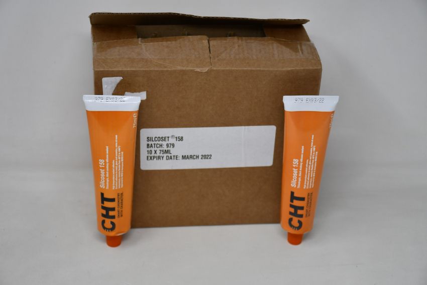 Ten boxed as new CHT Silcoset 158 (Thixotropic, black acetoxy silicone sealant).