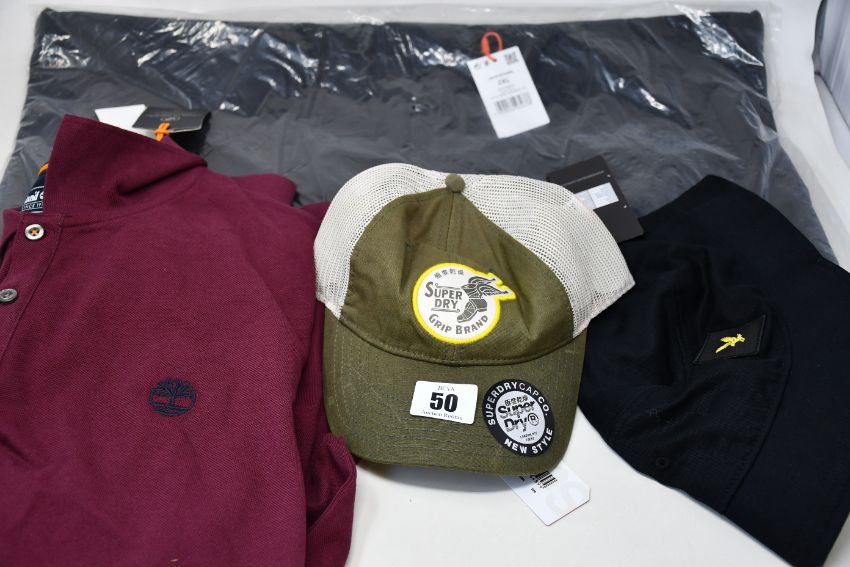Two as new Superdry Echo Beach jackets (XL, XXL - RRP £42 each), a Superdry Outdoorsman cap, Timberland long sleeve polo (L), Lyle & Scott cap and Lyle & Scott sun hat.