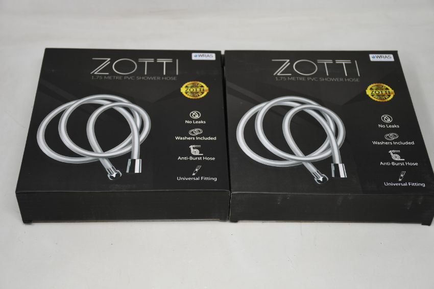 Ten Boxed Zotti 1.75m PVC Shower Hoses in silver colour.
