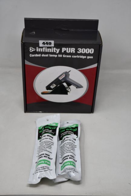 An Infinity PUR 3000 corded dual temp 50 gram cartridge gun and ten PUR WW30 polyurethane hot melt adhesive (Wood to wood) cartridges (50g).