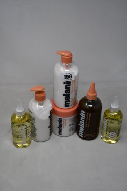 A collection of Melanin hair care products to include: two softening leave-in conditioner (475ml), two multi-use pure oil blend (237ml), one African Black Soap shampoo (475ml) and one Twist-elongating style cream (475ml).