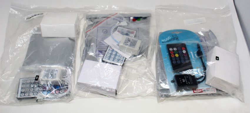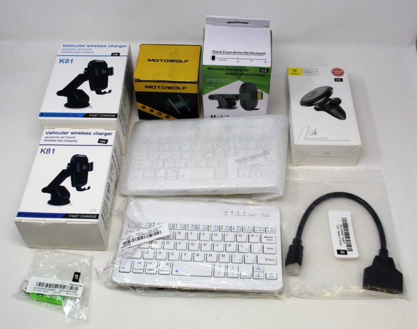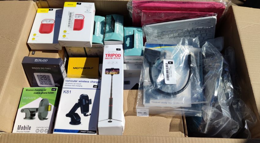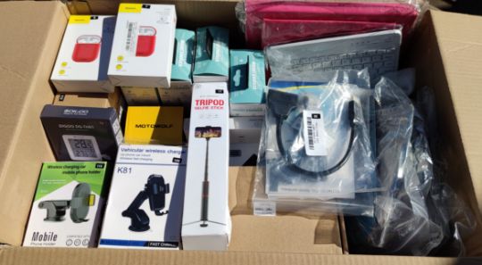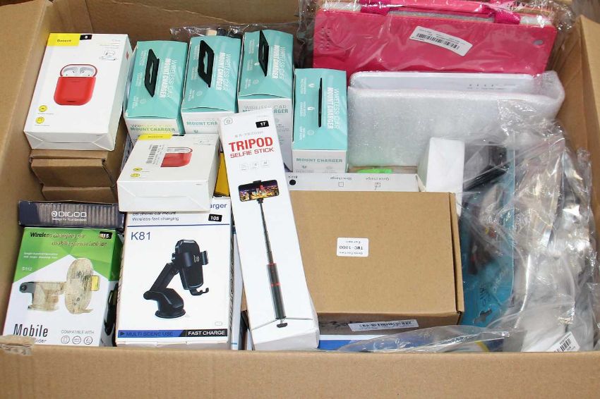 A box of assorted as new electrical items and accessories to include Airpod Charging Cases, LED striplights, Bluetooth keyboards, Selfie stick, Wireless Chargers and other items.