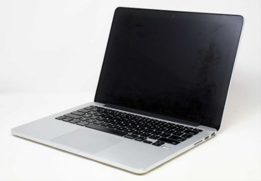 A pre-owned Apple MacBook Pro (Retina, 13-inch, Early 2015) in Silver with Intel Core i5 2.7 GHz, 8GB RAM, Intel Iris 6100 Graphics, 256GB Flash Storage running masOS X Yosemite (Serial: C02PRH7PFVH5) (Missing right arrow key'. Casing damaged and bent in several places) (Power supply and cables included).