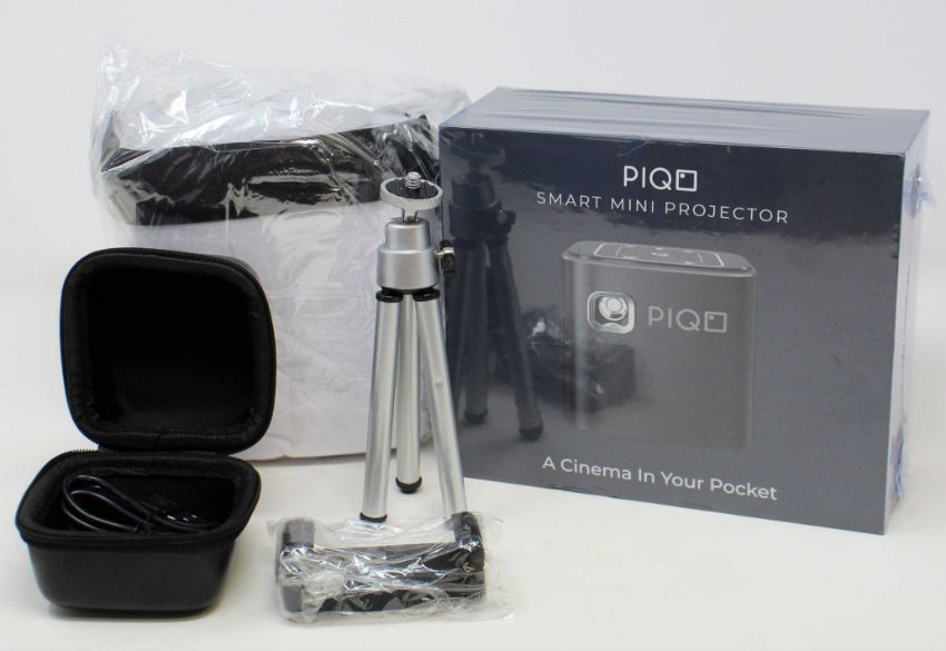 A boxed as new Piqo Smart Android Mini Projector (UK plug adaptor required) (Box sealed) with fabric projector screen, tripod, bracket and USB cable.