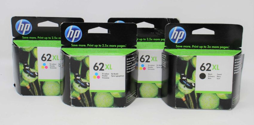 Three boxed as new HP 62XL Tri-color Ink Cartridges (C2P07AE ABE) (Expiry: July 2022) and one boxed as new HP 62XL Black Ink Cartridge (C2P05AE UUS) (Expiry: August 2022) (Boxes sealed, some damage to boxes).