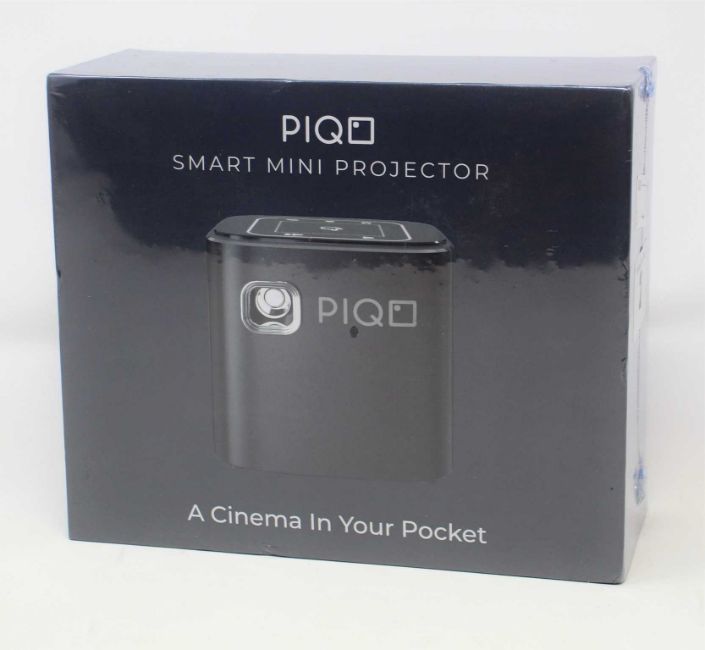A boxed as new Piqo Smart Android Mini Projector (UK plug adaptor required) (Box sealed).