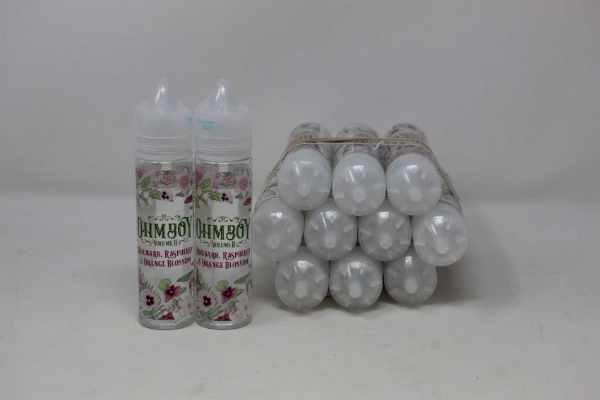 Twelve as new bottles of OHM Boy Volume II Rhubarb, Raspberry & Orange Blossom Botanicals E-Liquid 0mg 50ml (Over 18's only).