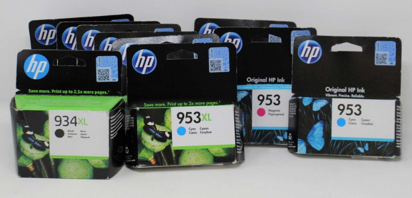 Six boxed as new HP 953XL Cyan Ink Cartridges (F6U16AE BGX) (Expiry: April 2022), two HP 953 Magenta Ink Cartridges (F6U13AE BGX) (Expiry: April 2022), one HP 953 Cyan Ink Cartridge (F6U12AE BGX) (Expiry: March 2022) and one HP 934XL Black Ink Cartridge (C2P23AE BGX) (Expiry: May 2022) (Boxes sealed, some damage to boxes).
