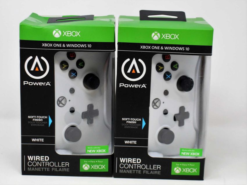 Two boxed as new PowerA Wired Controllers for Xbox One & Windows 10 in White (Boxes sealed, some damage to packaging).