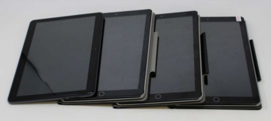 Four pre-owned Android Tablets; 2 x DuoDuogo 10.1" 64GB in Black (Boxed with accessories) 1 x DuoDuogo 10.1" 64GB in Black (Boxed with accessories) (Damaged charging port, sold for parts) and 1 x Beista K80 10.1" 64GB in Black (Boxed, no accessories) (All tablets FRP clear).