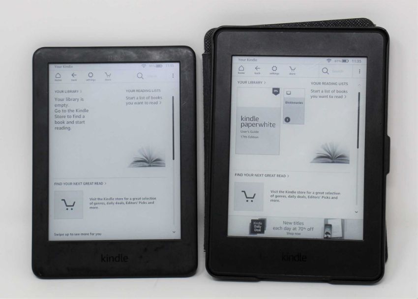 A pre-owned Amazon Kindle 10th Gen E-Reader in Black (M/N: J9G29R) (Some cosmetic scratches to casing) and a pre-owned Amazon Kindle Paperwhite in Black (M/N: DP75SDI) (Some damage to screen) with case.