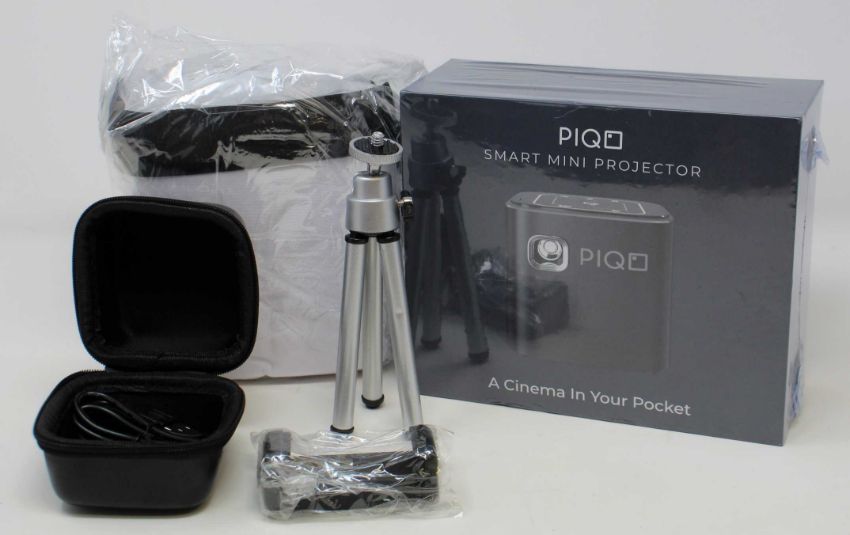 A boxed as new Piqo Smart Android Mini Projector (UK plug adaptor required) (Box sealed) with fabric projector screen, USB flash drive, tripod, bracket and USB cable.