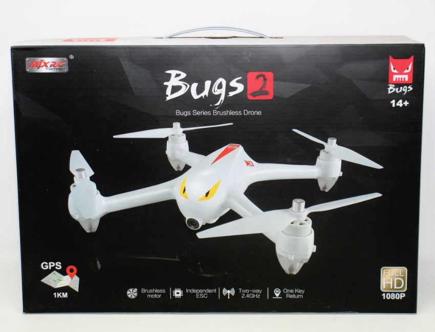 A boxed as new MJX Bugs 2 Brushless Quadcopter Drone (UK plug adapter required) (Box sealed).