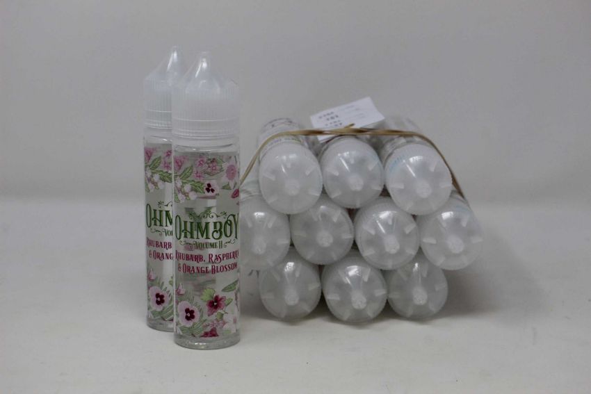 Twelve as new bottles of OHM Boy Volume II Rhubarb, Raspberry & Orange Blossom Botanicals E-Liquid 0mg 50ml (Over 18's only).
