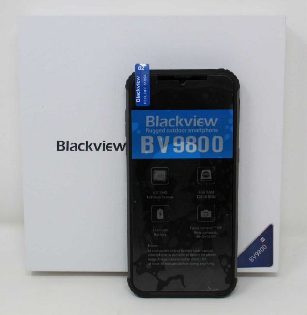 A pre-owned Blackview BV9800 (EEA) IP68 6GB 128GB Rugged Smartphone in Black (FRP clear, Checkmend report ID: CM16901756-C9E53) (Box and as new accessories included) (UK plug adapter required).