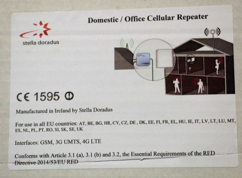 A boxed as new Stella Doradus StellaOffice Repeater 800 + 900MHz SD-RP1002-LG-4P (UK plug adaptoer required. Installation instruction and certificate of conformality in Spanish).