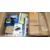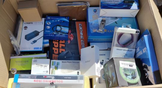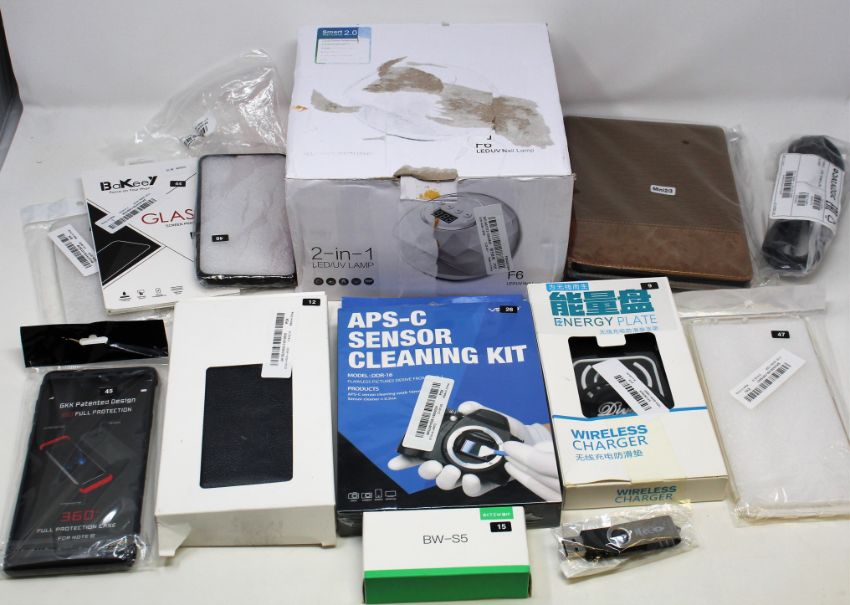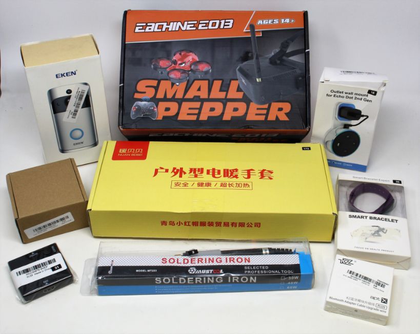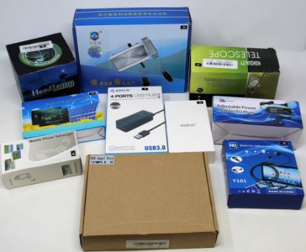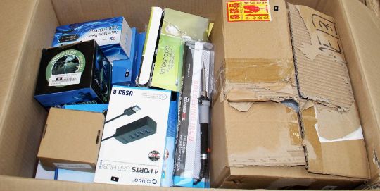 A box of assorted as new electrical items and accessories to include FPV Drone, Smart Doorbell, Electronic Door Lock, Smart Watch, USB memory stick and dozens of other items.