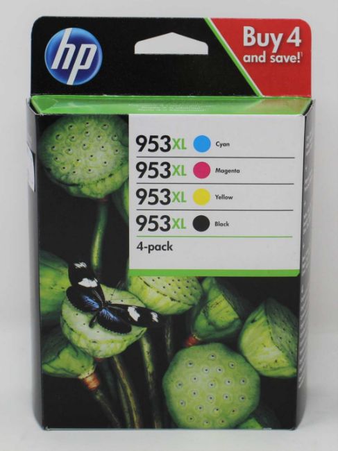 A boxed as new HP 953XL High Capacity Black & Colour Ink Cartridge 4 Pack (3HZ52AE) (Expiry May 2022).