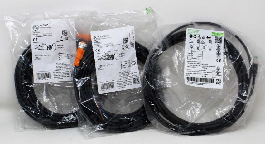Two as new IFM Electronic EVC003 M12 10M Sensor Cables and an as new Murr Elektronik 7000-88011-6310500 Sensor 5M Cable (Packaging sealed).