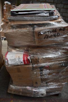 A pallet of miscellaneous flat pack furniture, household and related items.