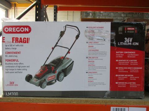 A boxed as new Oregon LM300 cordless lawnmower with battery and charger (Distressed box).