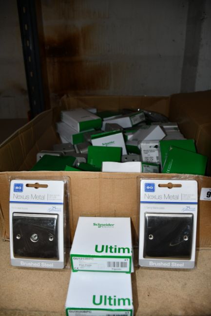 A box containing electrical supplies to include Schneider Ultimate Switched Sockets GU3520BPC (Low Profile 2 gang, 13A) and BG Nexus Metal 20A Double Pole Switches (Approximately 30 items).