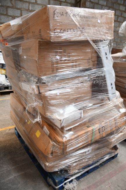 A pallet of miscellaneous flat pack furniture, household and related items.