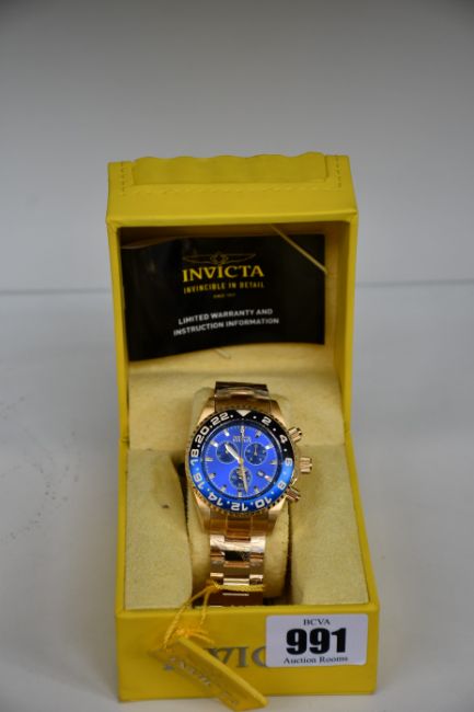 A boxed Invicta Model 29986 men's blue faced wrist watch.