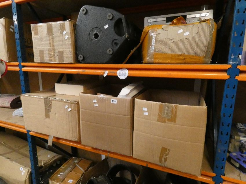 Two shelves of miscellaneous items to include Bose audio, an Aberlit Pro Beard and Hair Straightener and sex aids (Over 18s only).