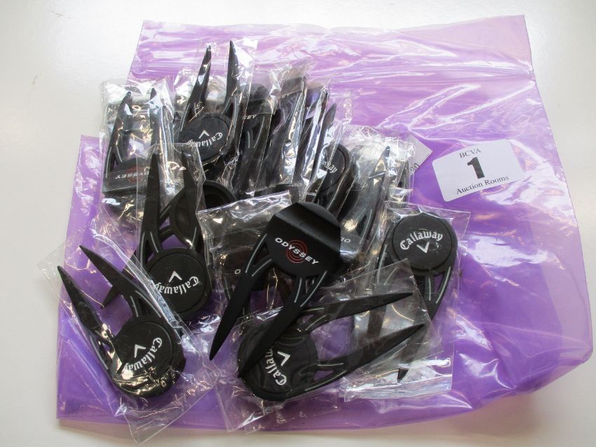 A quantity of Callaway Golf Double Prong Divot Repair Tool and Ball Markers (Approximately 20 items).